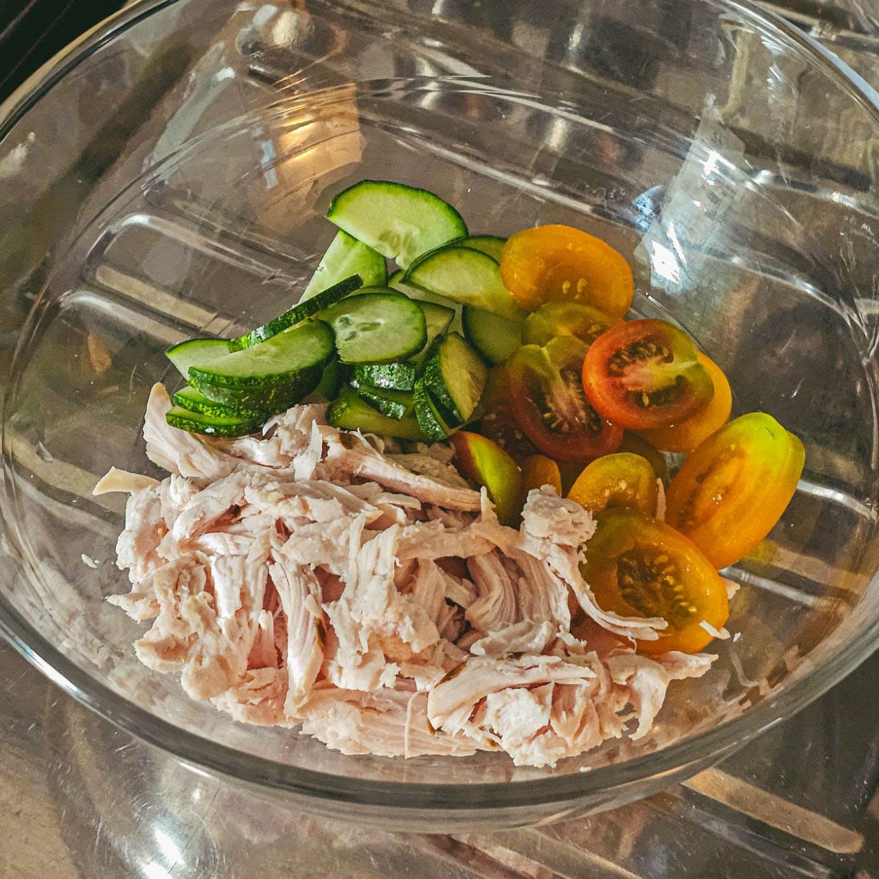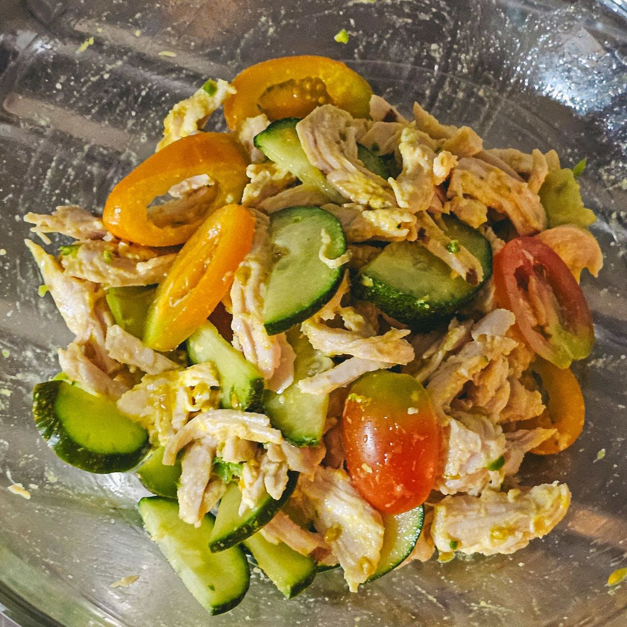- 채소(오이, 방울토마토, 쌈무(선택))와 닭가슴살을 양념장과 섞어줍니다.