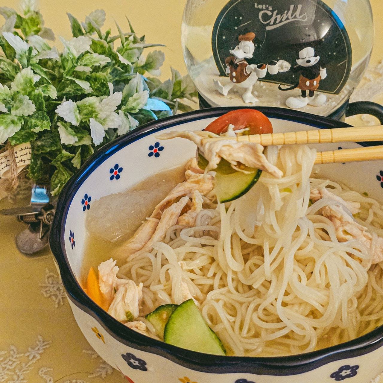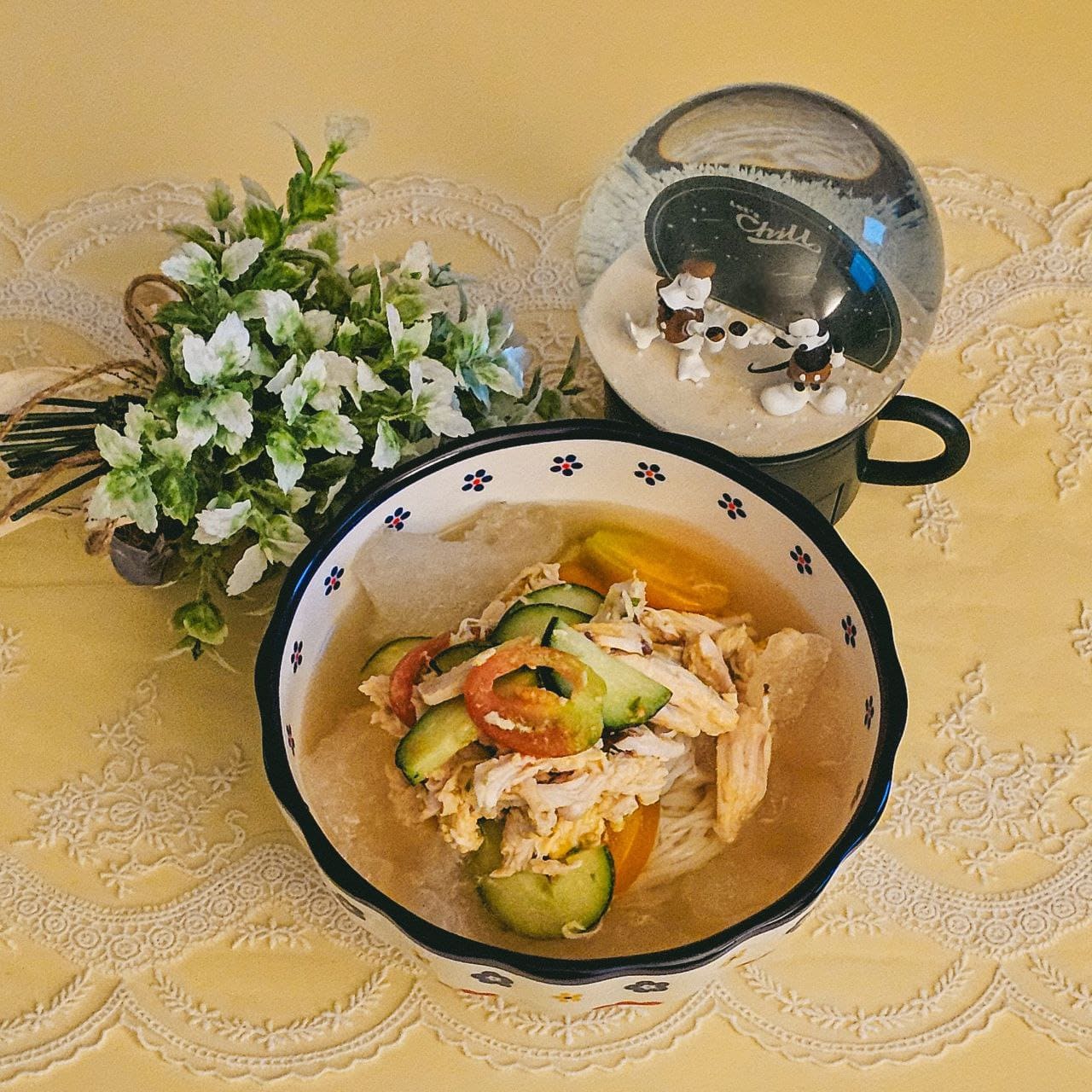 - 그릇에 소면, 무쳐놓은 채소와 닭가슴살을 닮고 육수를 부어 줍니다.